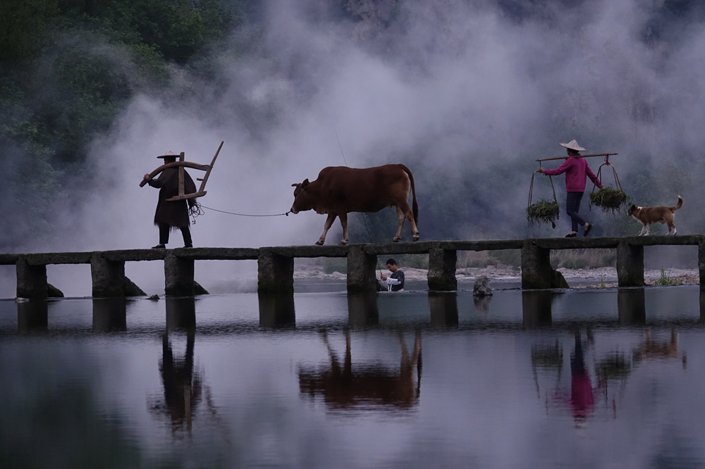 一對(duì)老夫妻一前一后,你牽著黃牛我挑著擔(dān),還自帶云霧繚繞的背景,多么美麗的畫面。李仁奇 攝