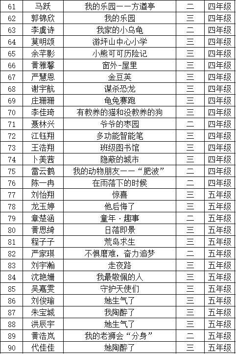 自2021年1月,活動(dòng)征稿啟動(dòng)以來,獲得了深圳市廣大中小學(xué)生、教師、文學(xué)愛好者的熱烈響應(yīng)積極參與,吸引了深圳百余所學(xué)校的上萬人關(guān)注報(bào)名?,F(xiàn)公布坪山區(qū)坪山中心小學(xué)晉級復(fù)賽名單如下: