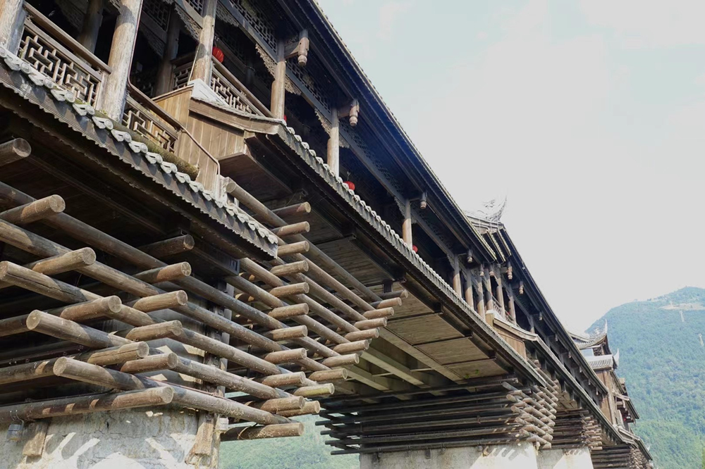 濯水廊橋長658米、寬5米,分為橋、塔、亭三部分,橋身為純木結(jié)構(gòu),建筑材料之間以榫頭卯眼互相穿插銜接,直套斜穿,牢固精密。李仁奇 攝