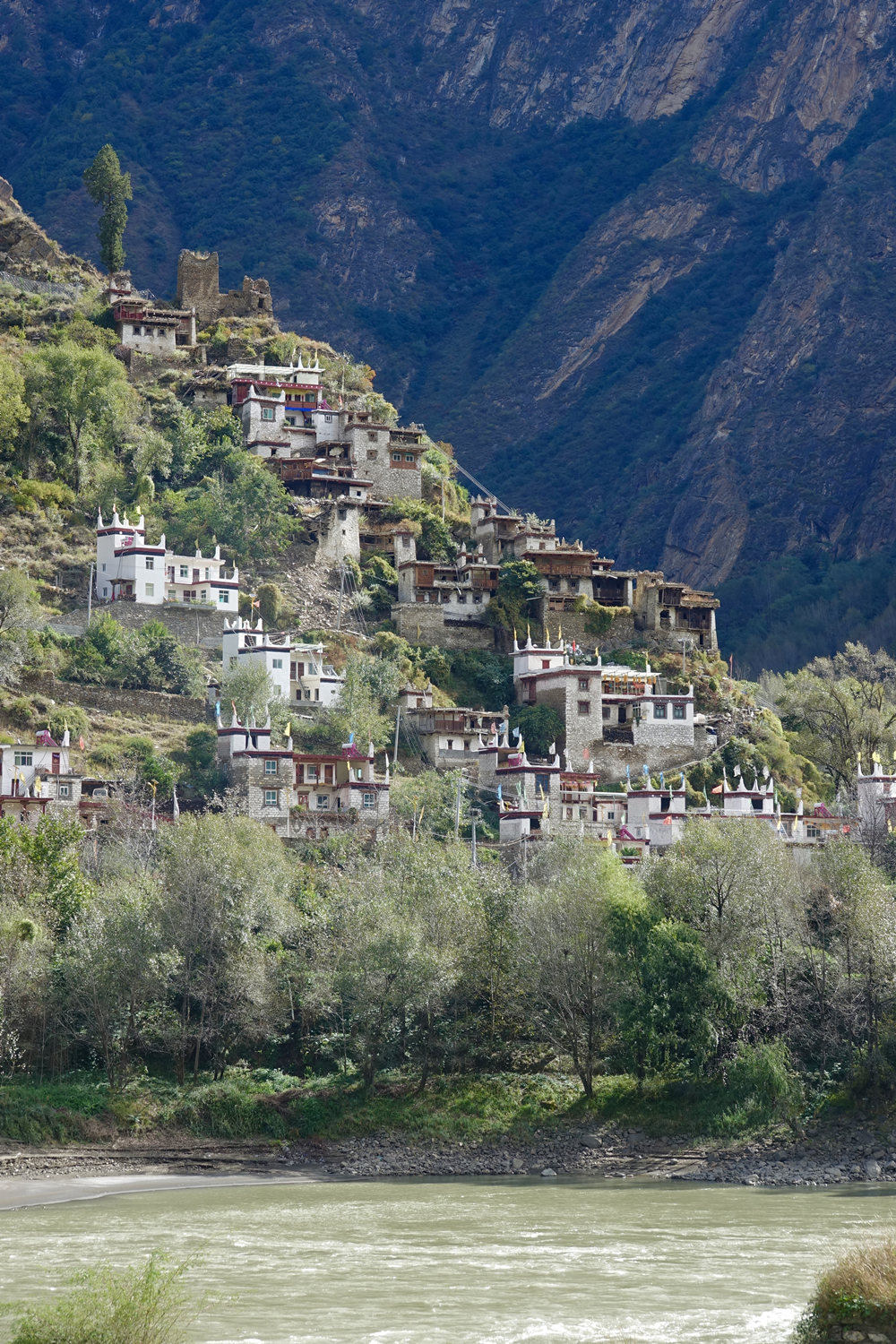 屋頂四個角落有白色的小佛塔,代表著山、樹、水、地四方神的四角,上面還插著經幡,每逢節(jié)日會進行祭祀,代表著嘉絨藏族的民俗風情。李仁奇 攝