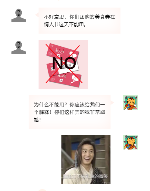 遇到春節(jié)、情人節(jié)等特殊時期,消費(fèi)者在團(tuán)購時應(yīng)當(dāng)看清使用期限,如商家未提前說明美食券的限用日期,而是去到現(xiàn)場才告知消費(fèi)者不能使用,則商家涉嫌侵害消費(fèi)者的知情權(quán)、公平交易權(quán)。如商家銷售美食券的頁面,注明情人節(jié)不能使用,此時商家盡到了提醒義務(wù),消費(fèi)者可在規(guī)定的其他時間內(nèi)使用美食券,或者向平臺申請退款。(消費(fèi)提示:消費(fèi)者購買團(tuán)購券時,要仔細(xì)閱讀團(tuán)購頁面的使用說明,特別是要仔細(xì)瀏覽團(tuán)購券使用時限。限用人數(shù)等具體內(nèi)容,避免遭遇買了卻用不了的困境。)