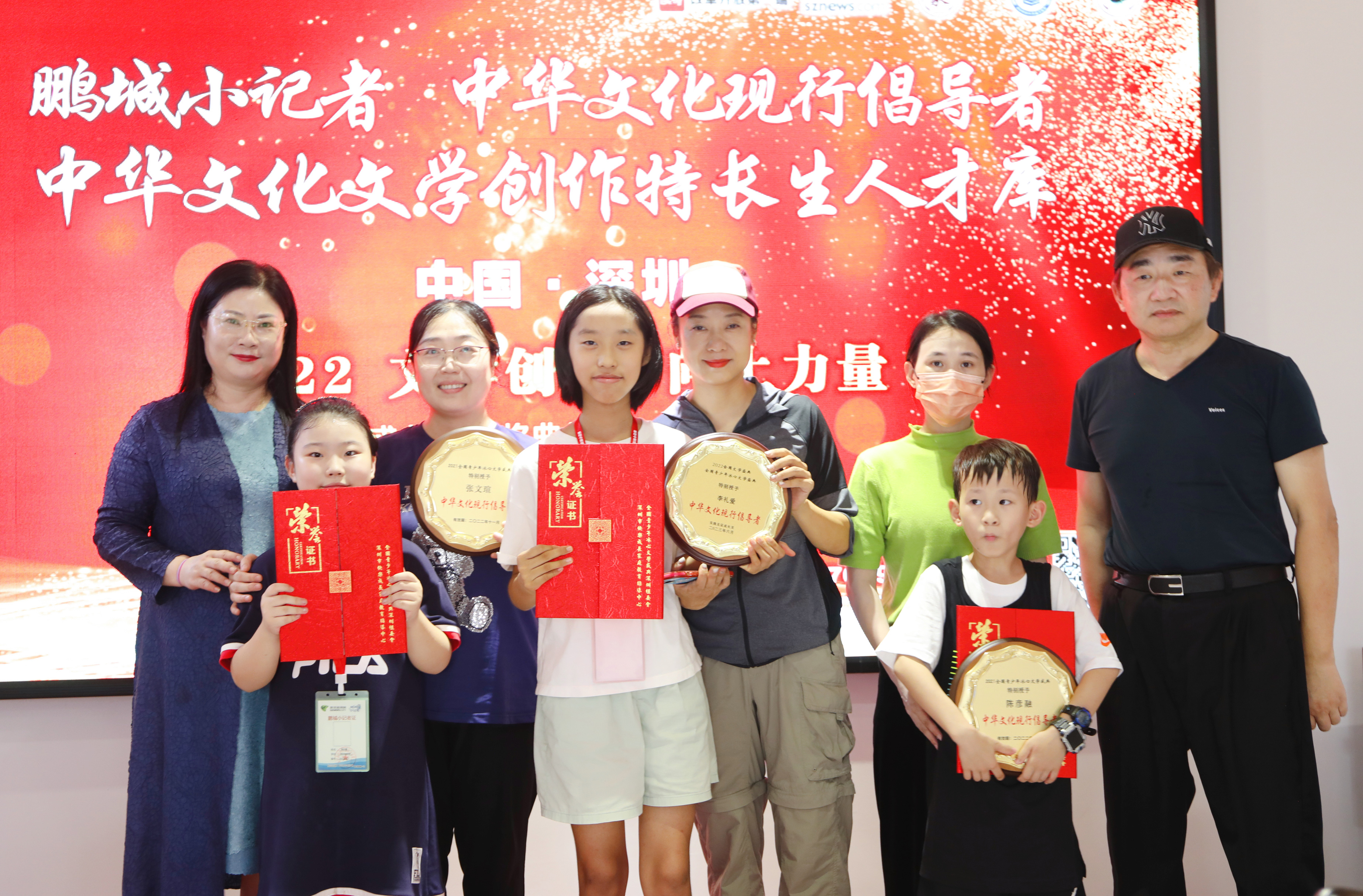 “中華文化現(xiàn)行倡導(dǎo)者”“中華文化文學(xué)特長(zhǎng)生人才庫(kù)”和“鵬城小記者”的優(yōu)生代表們與家長(zhǎng)、頒獎(jiǎng)嘉賓合影留念