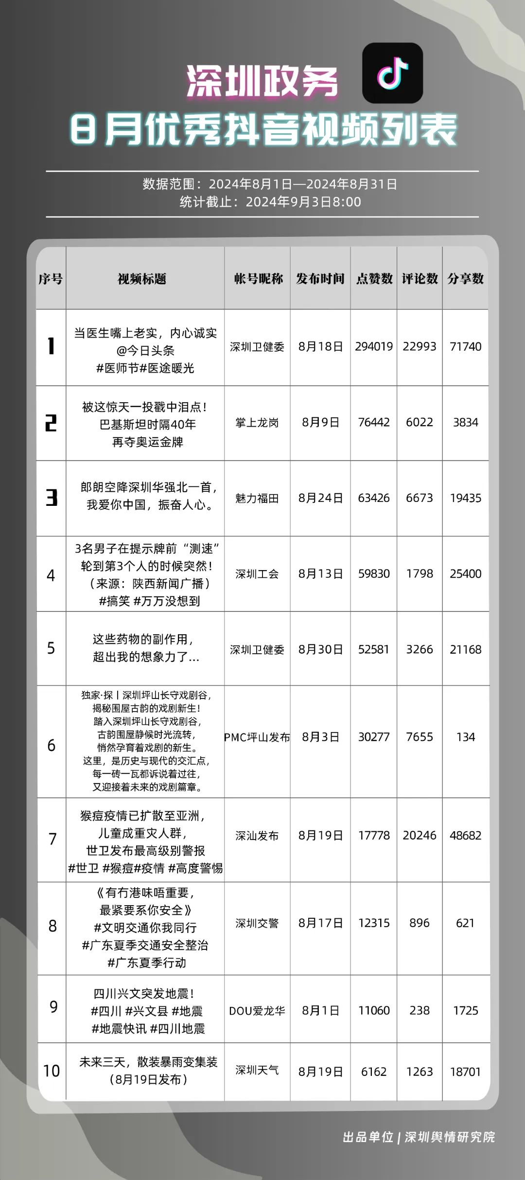 8月,“深圳衛(wèi)健委”“深汕發(fā)布”“掌上龍崗”“魅力福田”“深圳天氣”“深圳工會”“DOU愛龍華”“PMC坪山發(fā)布”“深圳交警”和“深圳公安”共10個政務(wù)抖音號獲得優(yōu)秀稱號,“深圳衛(wèi)健委”“深汕發(fā)布”“掌上龍崗”以高分居榜單前三,賬號有關(guān)“醫(yī)師節(jié)”“猴痘”“奧運(yùn)金牌”的視頻獲得了較高的關(guān)注度和討論度,相關(guān)優(yōu)秀視頻在傳播信息的同時,也展現(xiàn)了深圳政務(wù)抖音號在內(nèi)容質(zhì)量、互動性和傳播度方面的實(shí)力。