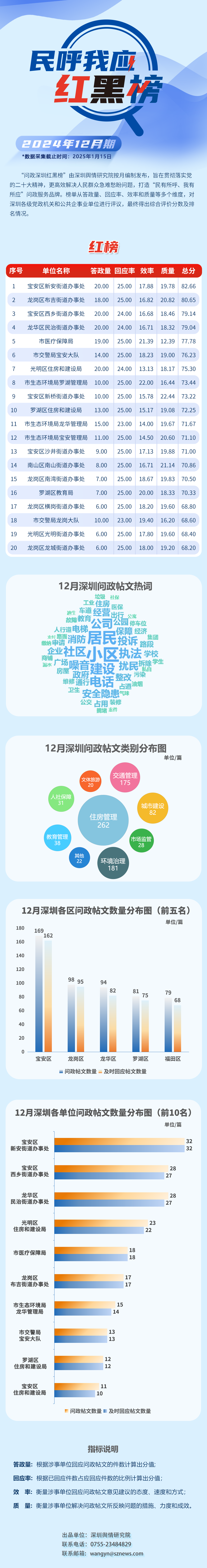 本期榜單采集的帖文主要來自深圳市及各區(qū)政府官網(wǎng)、深圳論壇、人民網(wǎng)領(lǐng)導(dǎo)留言板、深圳新聞網(wǎng)“民呼我應(yīng)”等平臺,所采集帖文發(fā)布時間為2024年12月1日至12月31日,采集截止時間為2025年1月15日。