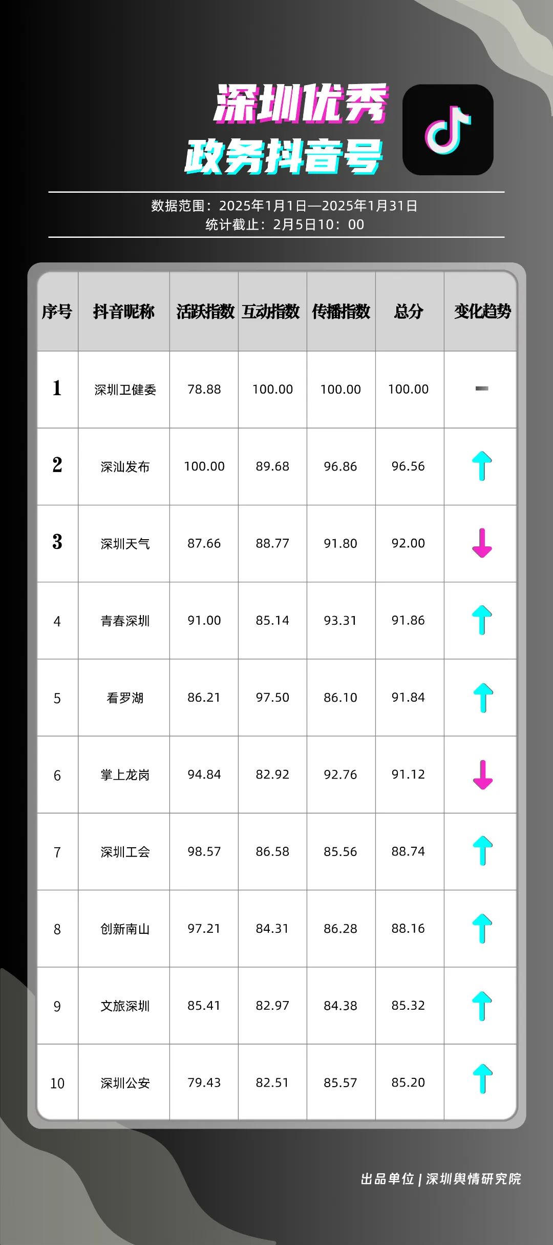 1月,“深圳衛(wèi)健委”“深汕發(fā)布”“深圳天氣”“青春深圳”“看羅湖”“掌上龍崗”“深圳工會”“創(chuàng)新南山”“文旅深圳”“深圳公安”共10個政務(wù)抖音號獲得“深圳優(yōu)秀政務(wù)抖音號”稱號?!吧钲谛l(wèi)健委”“深汕發(fā)布”“深圳天氣”成績優(yōu)異,綜合實力較強,位于榜單前列。“青春深圳”“看羅湖”等賬號排名有所提升,彰顯了這些賬號在拓寬受眾基礎(chǔ)、增強用戶黏性等方面所取得的積極成效。