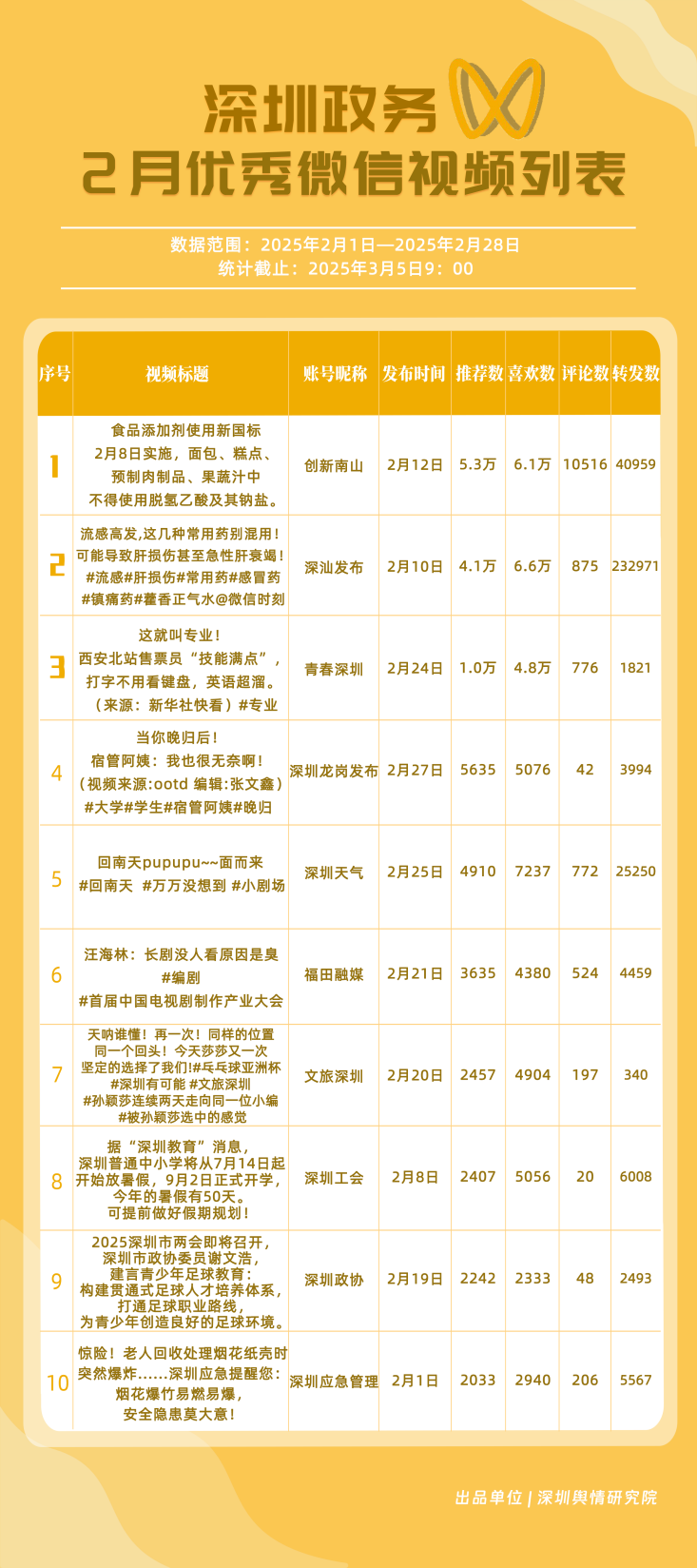 2月,“深汕發(fā)布”“深圳天氣”“魅力福田”“深圳衛(wèi)健委”“文旅深圳”“掌上龍崗”“青春深圳”“DOU愛龍華”“深圳工會(huì)”“深圳公安”共10個(gè)政務(wù)抖音號(hào)獲得“深圳優(yōu)秀政務(wù)抖音號(hào)”稱號(hào)?!吧钌前l(fā)布”位于榜單第一名,值得關(guān)注的是,該賬號(hào)2月作品總分享數(shù)超20萬次,其中有關(guān)“華南地區(qū)回南天”的視頻單條分享量達(dá)到19萬次以上,展現(xiàn)出強(qiáng)勁的傳播力?!吧钲谔鞖狻薄镑攘ΩL铩薄吧钲谛l(wèi)健委”三賬號(hào)堅(jiān)持輸出優(yōu)質(zhì)內(nèi)容,得分均在94分以上,展現(xiàn)出深圳政務(wù)新媒體賬號(hào)在短視頻傳播領(lǐng)域的創(chuàng)新活力。