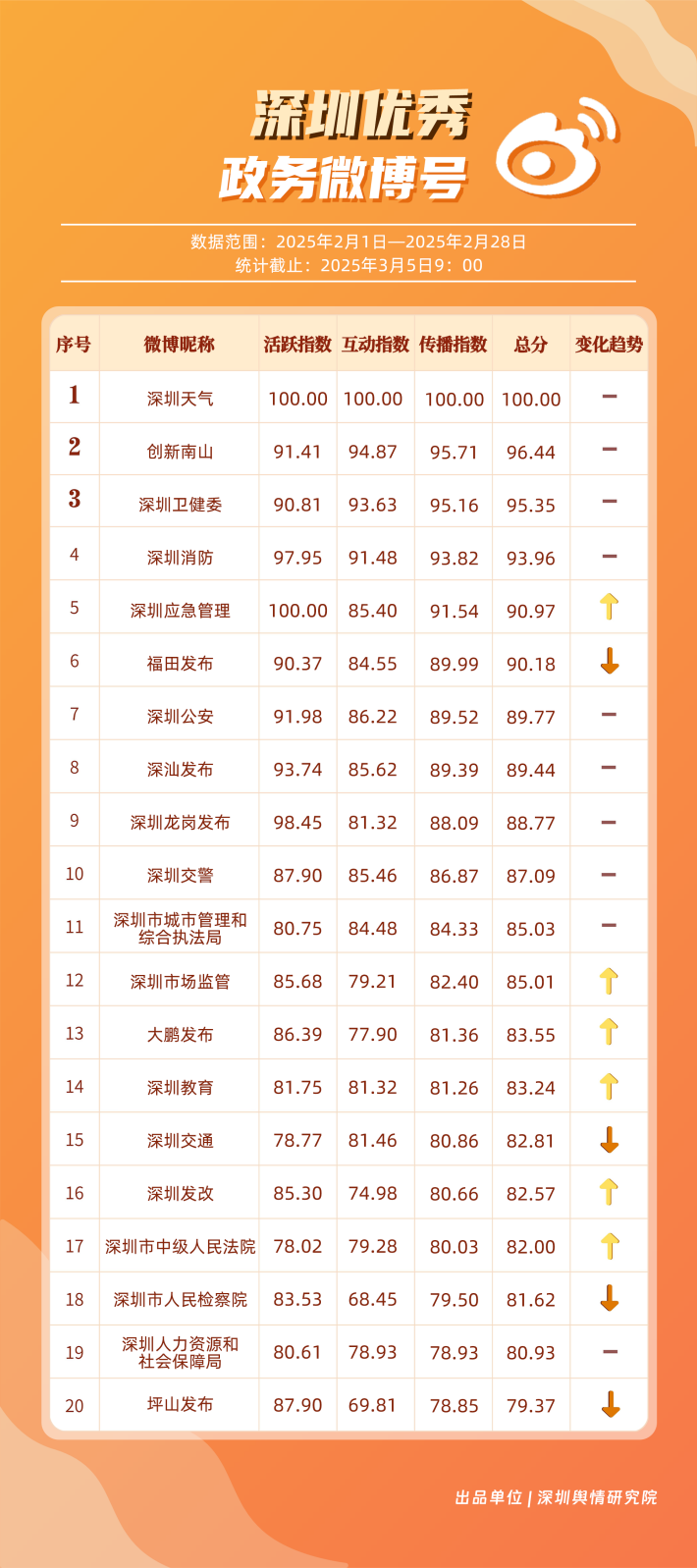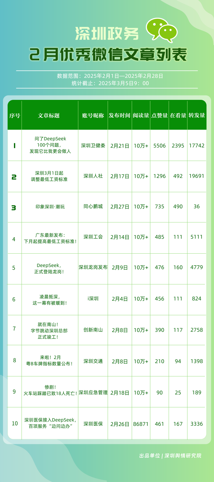 2025年2月期《深圳優(yōu)秀政務(wù)新媒體矩陣》發(fā)布,本期榜單框架有所優(yōu)化,公眾號(hào)、微博號(hào)、抖音號(hào)、視頻號(hào)得分在綜合計(jì)算時(shí)的權(quán)重調(diào)整為30%、20%、30%、20%。公眾號(hào)榜單中,根據(jù)閱讀量超10萬次的文章篇數(shù),在傳播指數(shù)額外加分,激勵(lì)優(yōu)質(zhì)內(nèi)容產(chǎn)出。接下來,讓我們一同揭曉,2月哪些矩陣成為政務(wù)信息傳播與服務(wù)創(chuàng)新標(biāo)桿,為政務(wù)新媒體矩陣創(chuàng)新發(fā)展樹立高質(zhì)量發(fā)展范式。