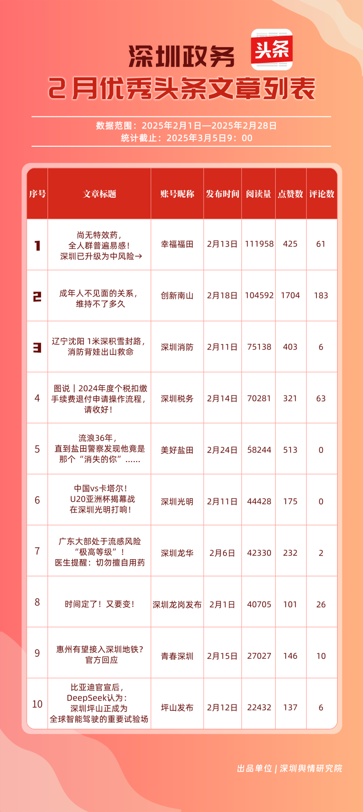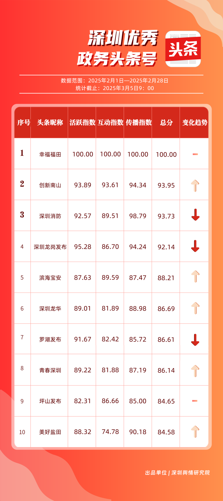 2月,“幸福福田”“創(chuàng)新南山”“深圳消防”“深圳龍崗發(fā)布”“濱海寶安”“深圳龍華”“羅湖發(fā)布”“青春深圳”“坪山發(fā)布”“美好鹽田”共10個(gè)政務(wù)頭條號(hào)入選“優(yōu)秀政務(wù)頭條號(hào)”榜單。“幸福福田”2月今日頭條作品總閱讀數(shù)超60萬,綜合實(shí)力較強(qiáng),多次位居頭條平臺(tái)榜單第一?!皠?chuàng)新南山”“深圳消防”“深圳龍崗發(fā)布”總分均在90分以上,展現(xiàn)出深圳政務(wù)頭條號(hào)的持續(xù)影響力,為其他政務(wù)賬號(hào)提供了可借鑒的運(yùn)營范例。