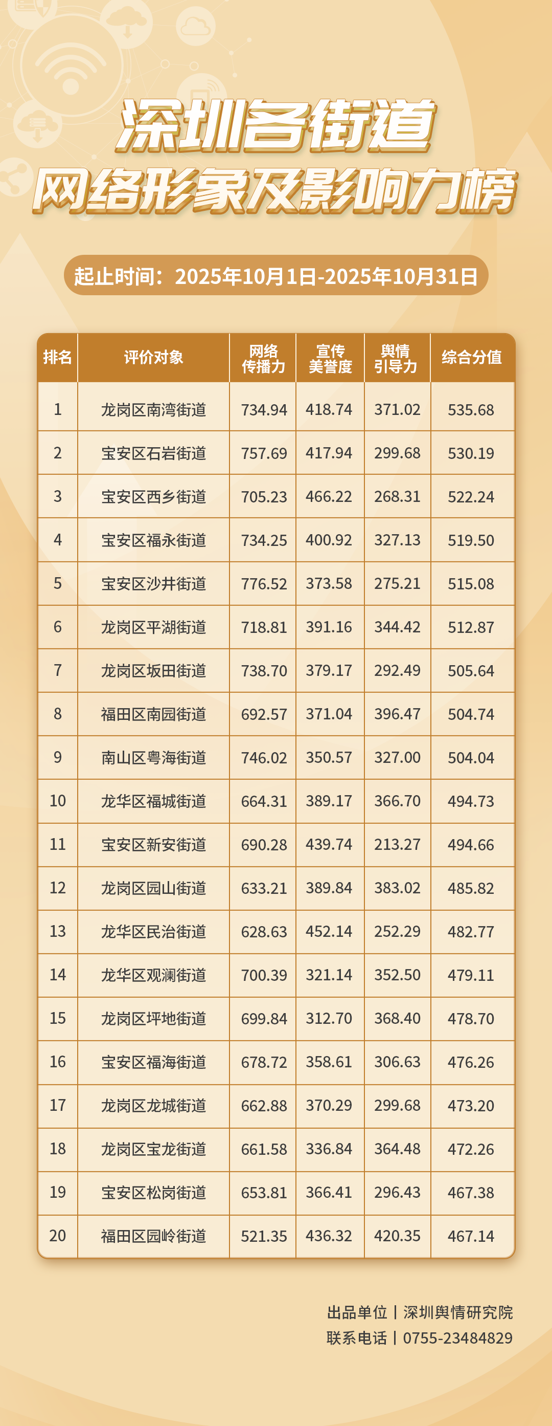 為深入了解深圳市各街道的網(wǎng)絡(luò)形象構(gòu)建狀況和社會影響,推動街道治理“提質(zhì)增效”,增強(qiáng)城市高質(zhì)量發(fā)展動能,深圳輿情研究院編制推出《深圳各街道網(wǎng)絡(luò)形象及影響力榜》。榜單具有獨立客觀的評價體系,通過數(shù)據(jù)采集和分析,評估各街道的網(wǎng)絡(luò)傳播力、宣傳美譽(yù)度及輿情引導(dǎo)力,并對全市11個區(qū)共78個街道的網(wǎng)絡(luò)形象及影響力進(jìn)行綜合排名。