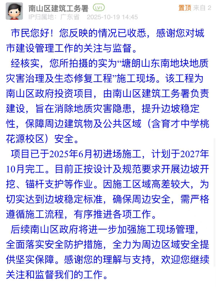 案例點評:針對市民疑慮,相關部門的回應展現(xiàn)出“透明化+精細化”的治理思路:第一時間明確工程屬性并同步告知工期安排,主動消解市民對工程進展的不確定性擔憂;同時,南山區(qū)建筑工務署還表示后續(xù)將進一步加強現(xiàn)場管理,回應關切。這種回應思路既解決了市民的困惑,也通過可感知的舉措傳遞了對安全的重視態(tài)度,是城市工程類訴求處置中“信息公開”“風險閉環(huán)”的有效示范。