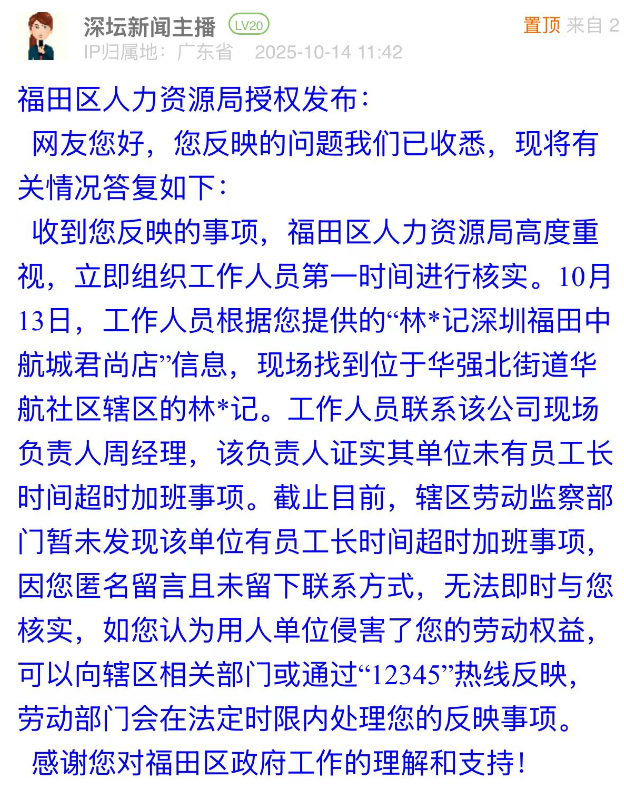 優(yōu)化建議:網(wǎng)民投訴的核心有兩點,一是外包公司無勞務派遣資質卻代繳社保、發(fā)放工資,二是工作時間過長。福田區(qū)人力資源局雖回應已核實涉事餐飲單位“無長時間超時加班”,但對網(wǎng)民反映的外包公司無資質這一關鍵問題未作回應。此情況反映出,資質核查工作亟需加強,如對相關餐飲單位開展用工合規(guī)專項檢查,以精準舉措解決無資質外包這一核心痛點,提升市民對勞動者權益保障工作的認可度。